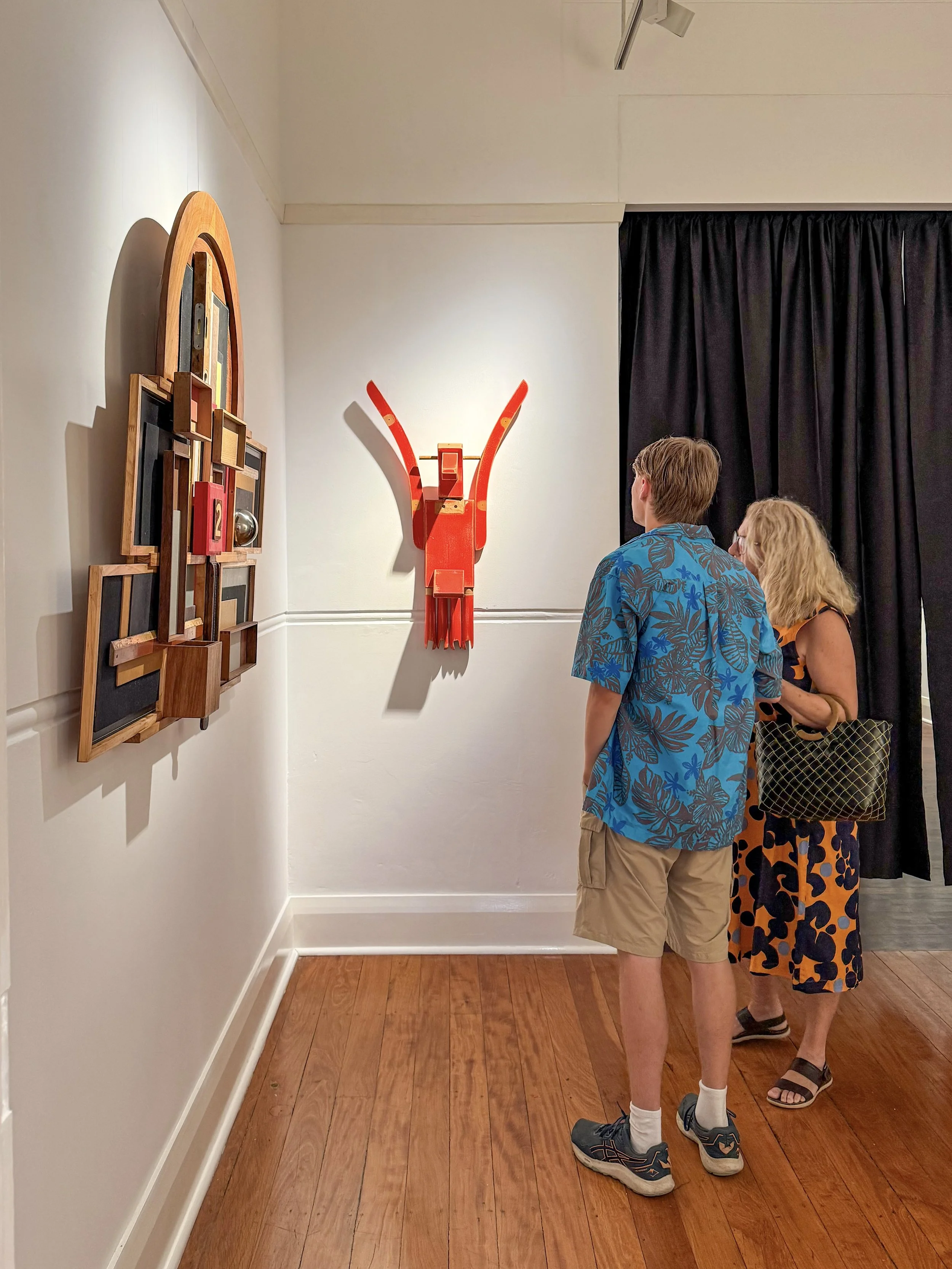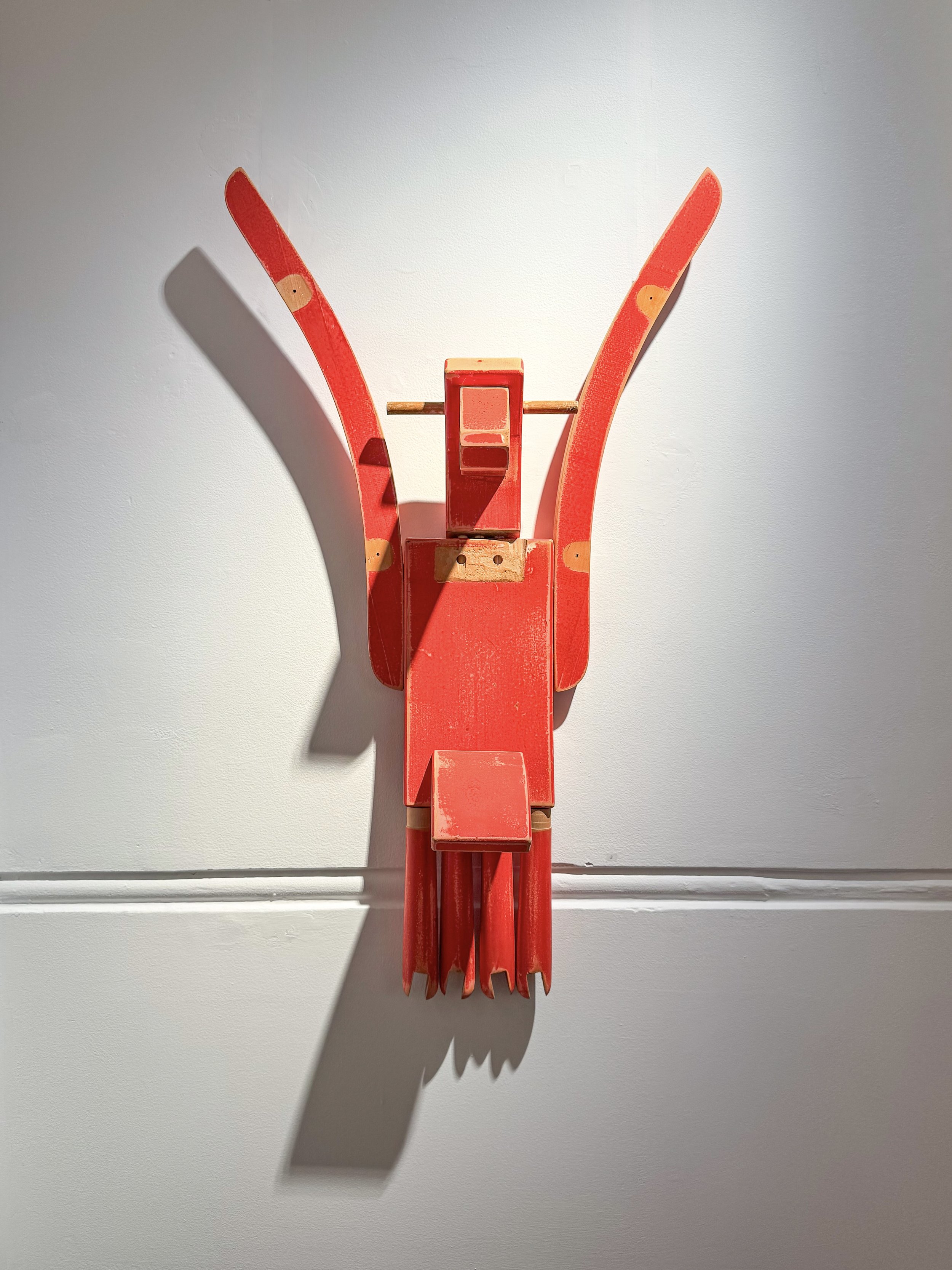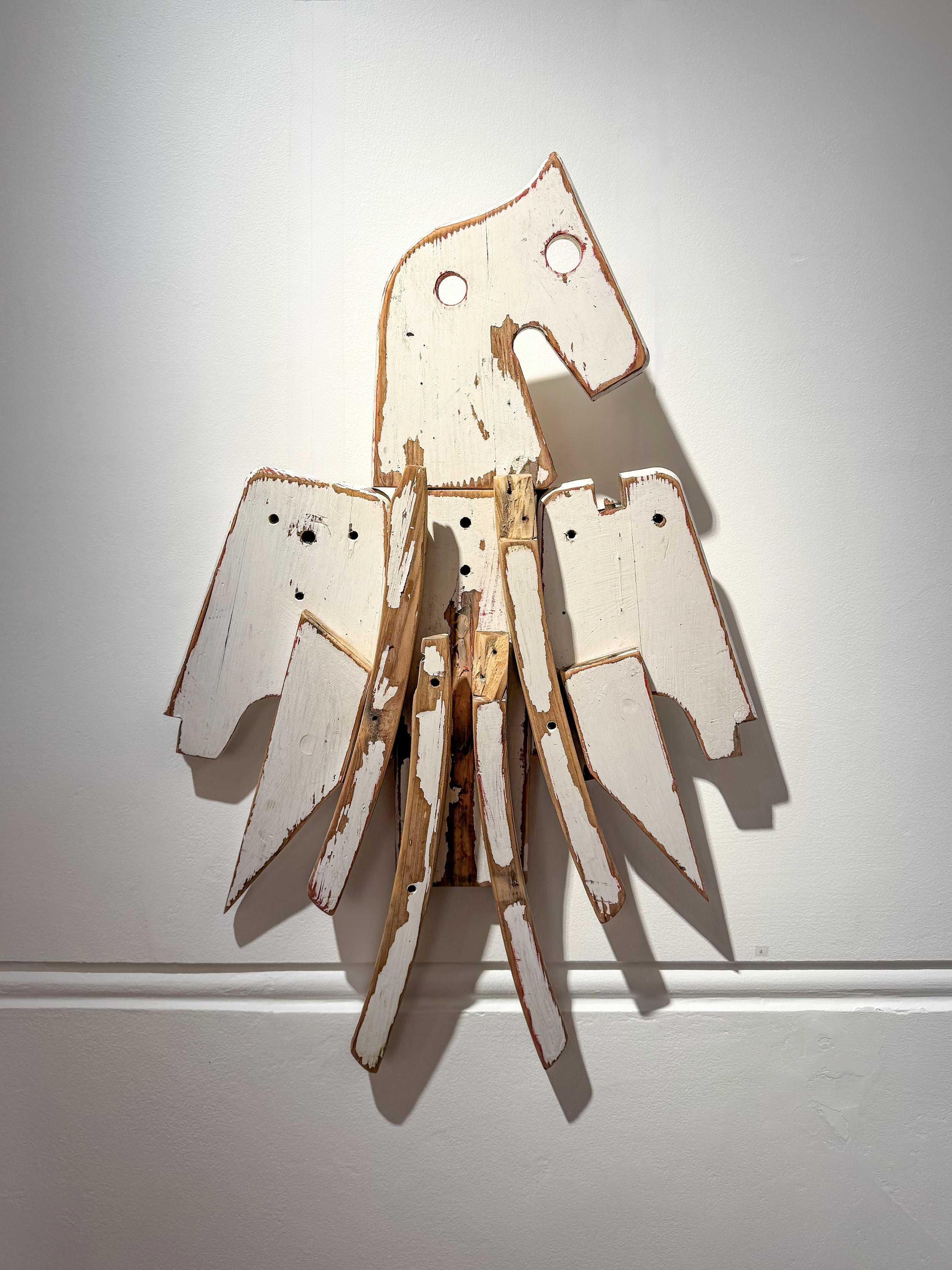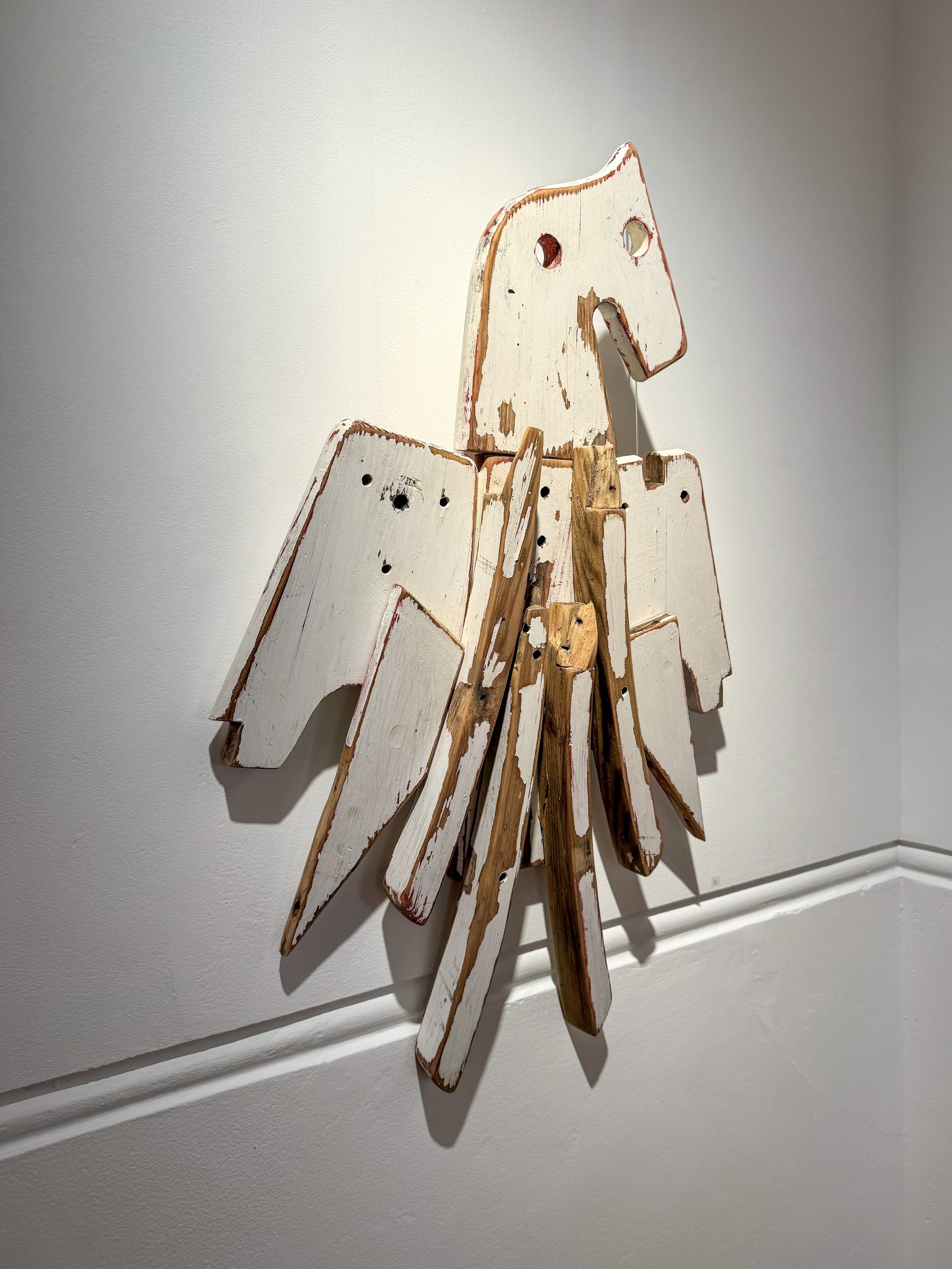 Two works begin as timber rocking horses—one reconfigured as Pegasus, the other transformed into Fire Horse. Once playful and recognisable, their components are taken apart, laid bare, and restructured into new identities that sit somewhere between figure and abstraction.