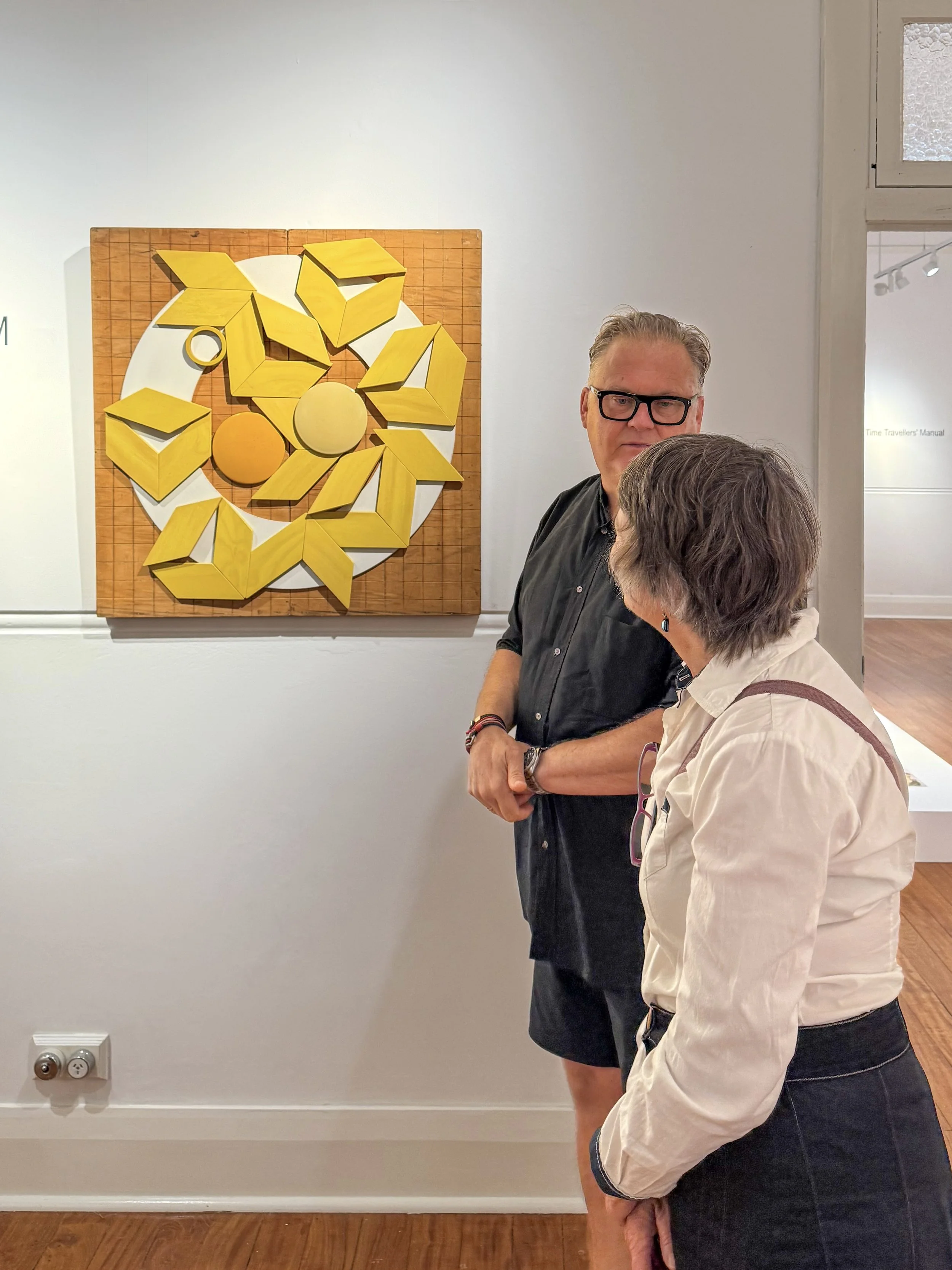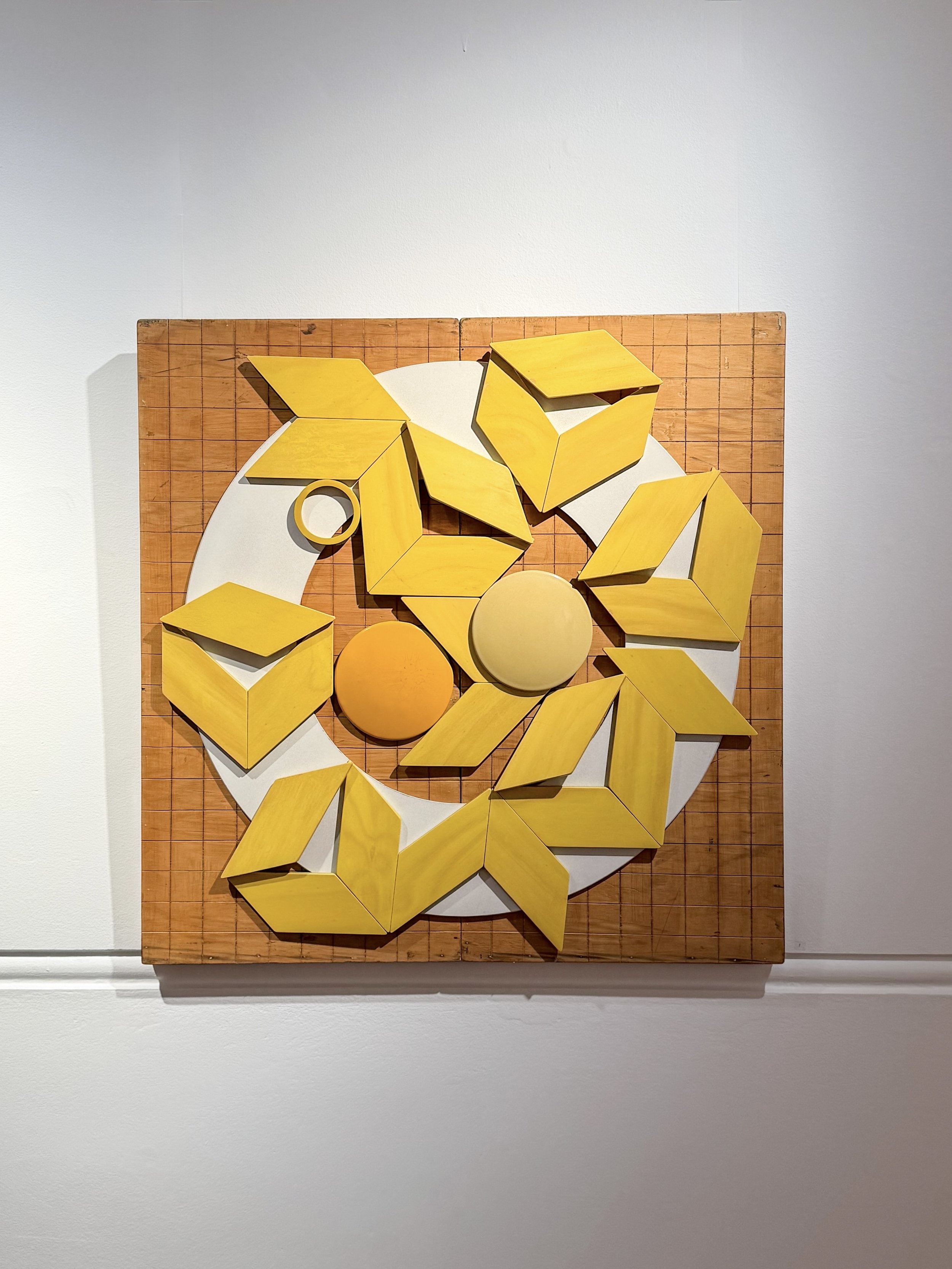 In Shifting Light, folded yellow planes radiate across a circular ground, creating movement through repetition and rotation.